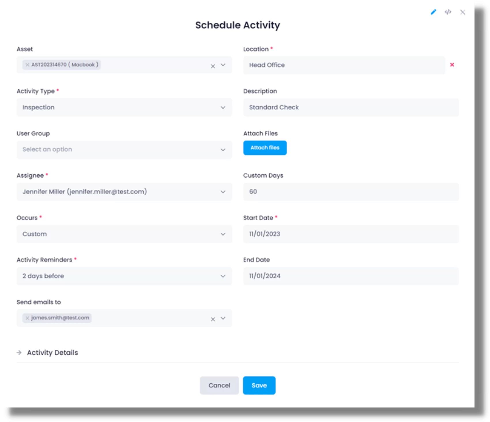 إنشاء جداول الصيانة للأصول الفردية أو المتعددة. حدد نوع الأنشطة الخاصة بك التي تتكرر يوميًا أو أسبوعيًا أو شهريًا أو سنويًا.
